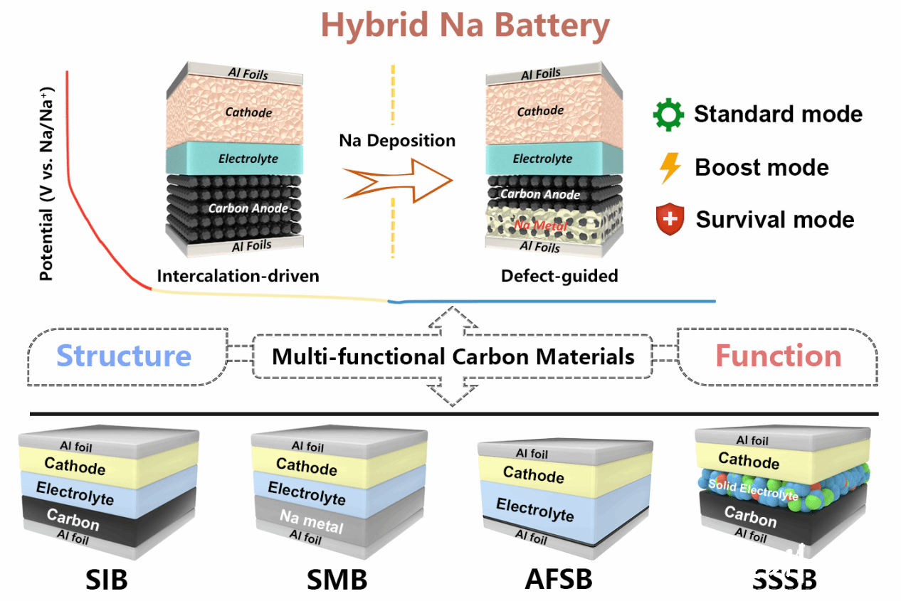 钠基电池凭借丰富的钠资源和成本优势,成为锂基系统的理想替代方案,并且不同钠基电池表现出不同的应用特性。然而其实际应用仍面临能量密度低、循环寿命短及安全隐患等挑战。目前碳材料凭借可调节的物理化学特性,广泛应用于多类钠电池中,为提升电池性能提供了创新解决方案。因此,充分挖掘碳材料的多功能潜力尤为重要。通过发挥这种潜力,开发先进的多功能钠基电池成为可能。