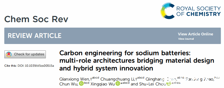 近日,我校化材学院吴星樵博士/侴术雷教授团队在国际权威期刊Chemical Society Reviews上发表题为《Carbon engineering for sodium batteries: multi-role architectures bridging material design and hybrid system innovation》的综述论文。该综述针对碳基材料在不同钠电池中的角色和功能转变,系统地探究了碳基材料在四种钠电池(钠离子电池,钠金属电池,无负极钠电池,固态钠电池)上的应用、结构参数上差异及共性表现,总结了碳基材料在钠电池中性能表现的多种本征/非本征的影响因素。此外,以多功能的碳基材料为基础,提出了”插层驱动“和”缺陷诱导“双储能模式的杂化钠电池,并针对不同工作环境提出三种自适应的工作模式(标准、增程、生存)。